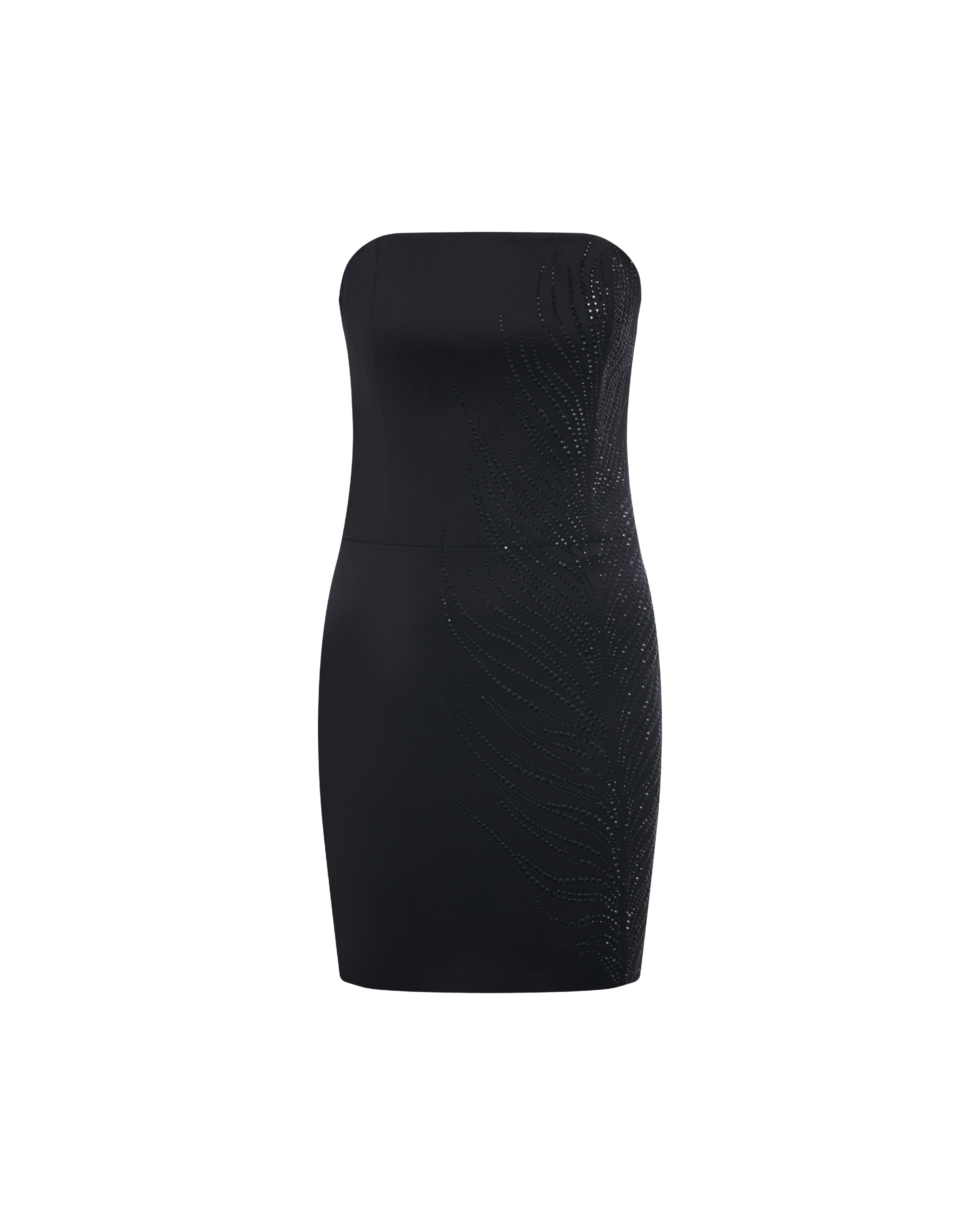 This strapless black mini dress is cut in a sleek bodycon silhouette, elevated with an abstract rhinestone fmotif, radiating modern glamour and sculptural allure.