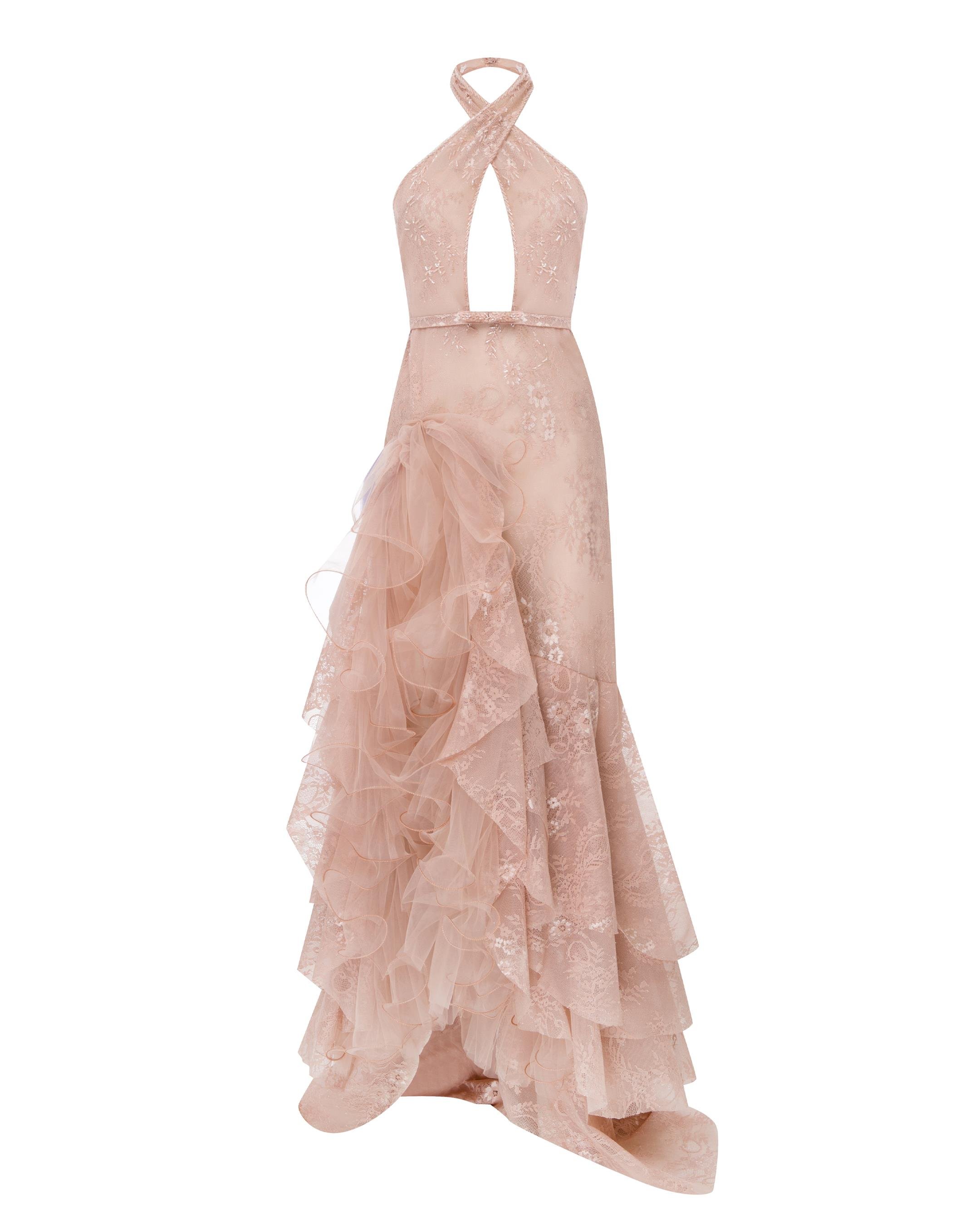 The Anna gown is cut from delicate lace, featuring a daring front cutout and cascading ruffled panels. Style it with statement jewellery and sleek heels to create an unforgettable evening look.
