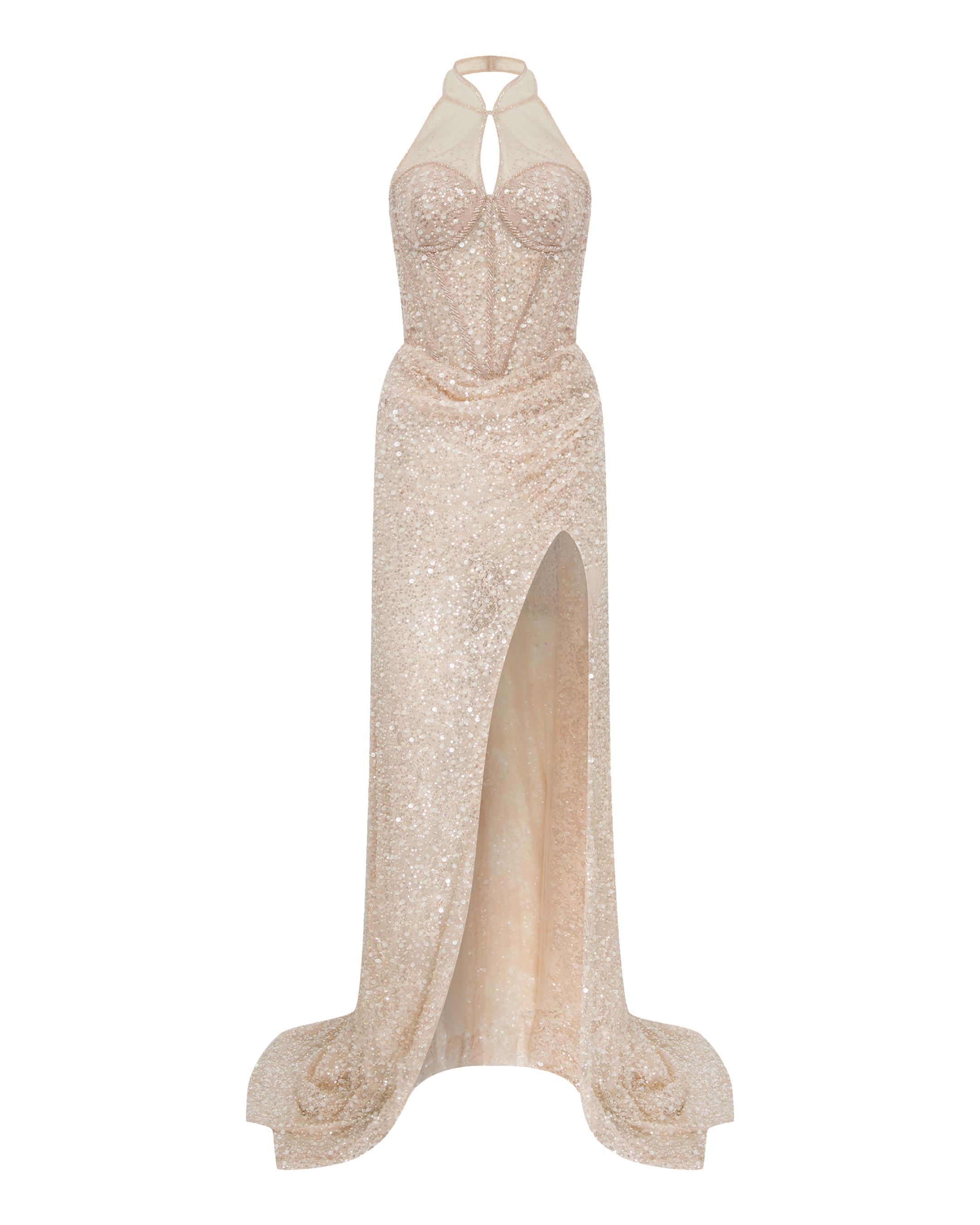 The Anna Maria gown is a sheer, barely-there design crafted from fluid nude mesh with clear, shimmering sequins and soft drapings.