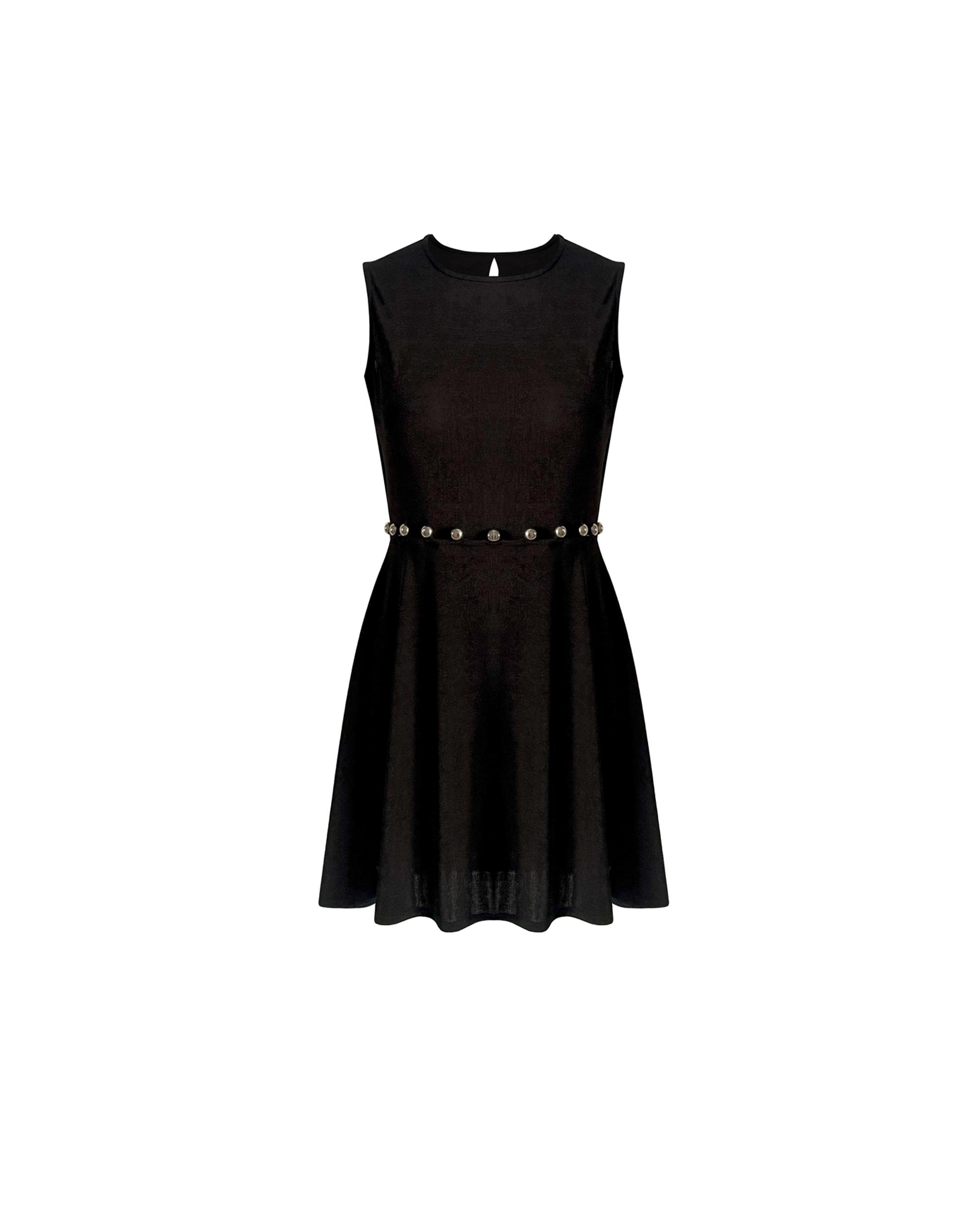 • Black mini dress • Round neckline, sleeveless design • Adjustable side cut-outs at the waist connected with stud buttons • Can be styled with two open panels, a single-side opening, or fully closed at the waist • A-line skirt • Handwash or dry cleaning is recommended