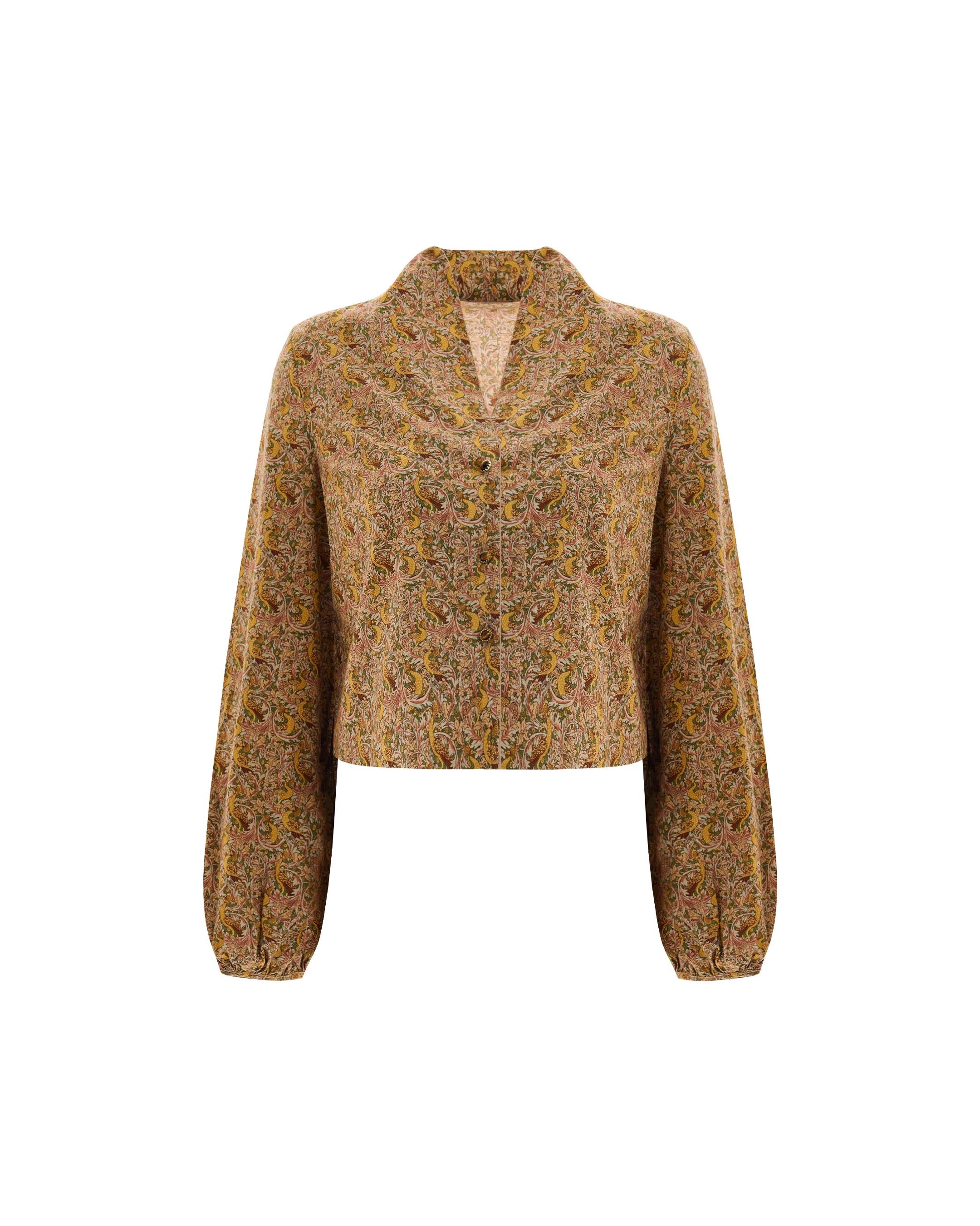 This patterned shirt balances vintage romance with a sculptural twist, its softly structured silhouette and lantern sleeves evoke a quiet yet outstanding elegance.
