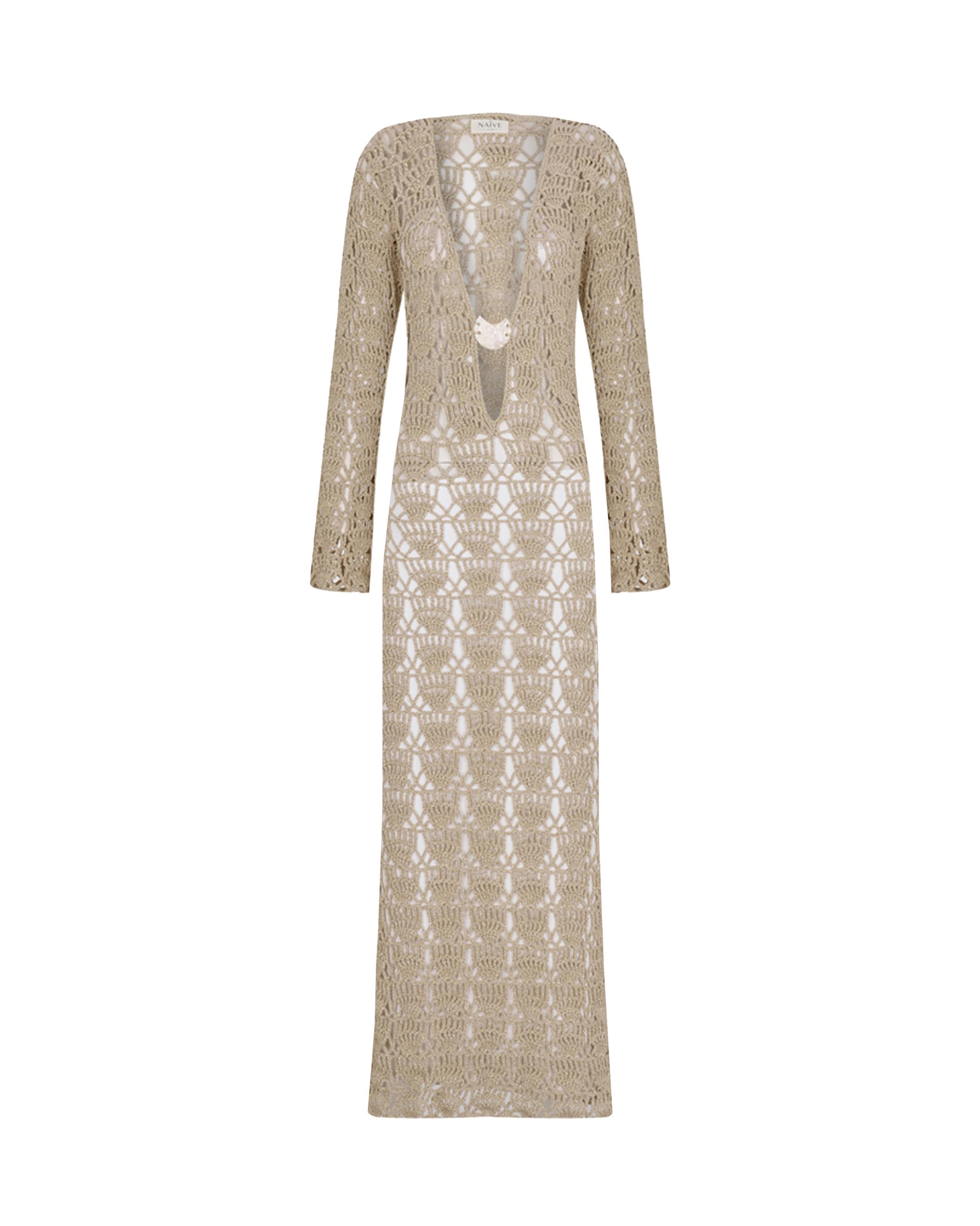 • Hand-crocheted long dress with deep V neck and mother of pearl accessory