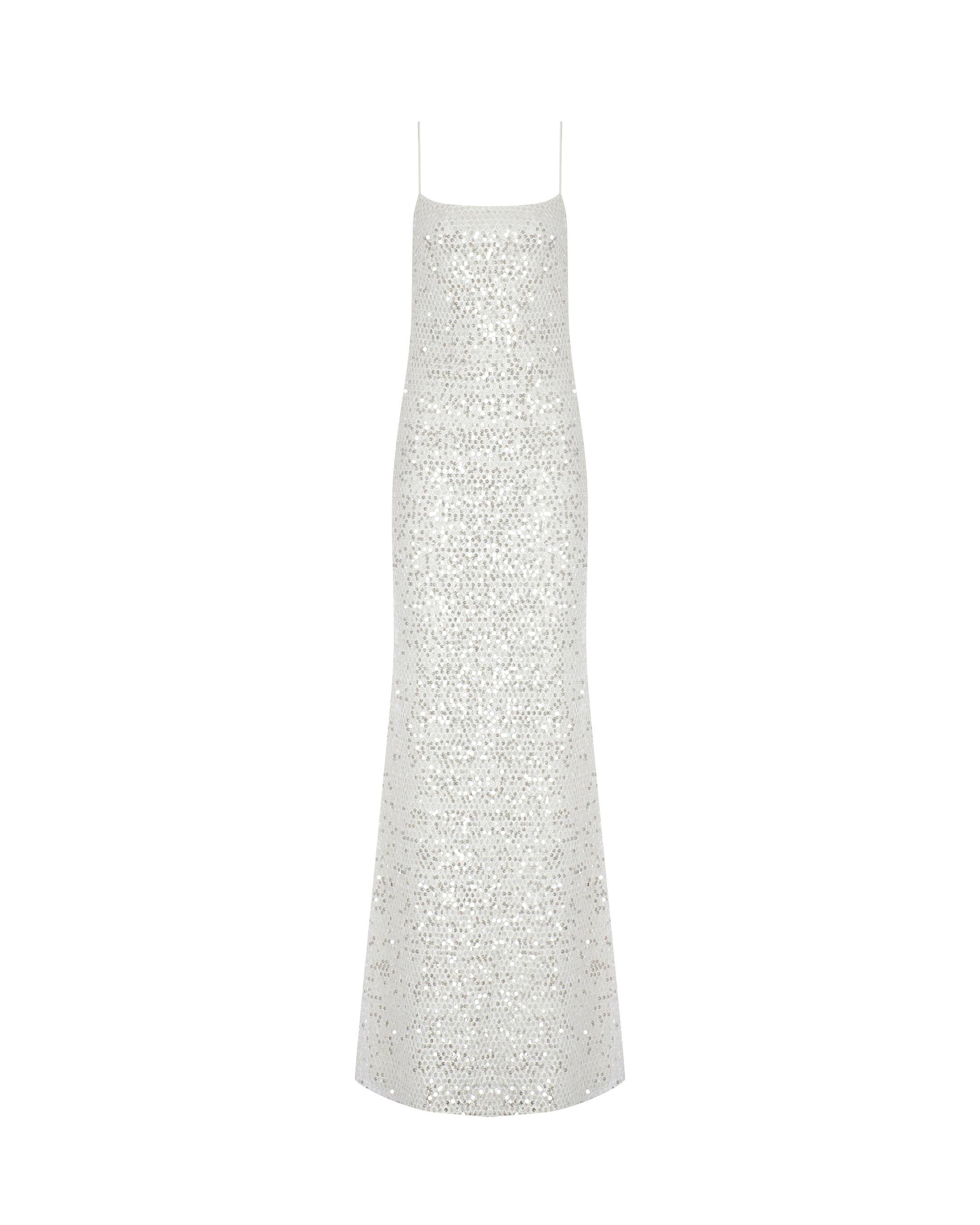 The Ember floor-grazing column silhouette dress is covered in shimmering sequins in a metallic silver-tone hue for maximum impact.