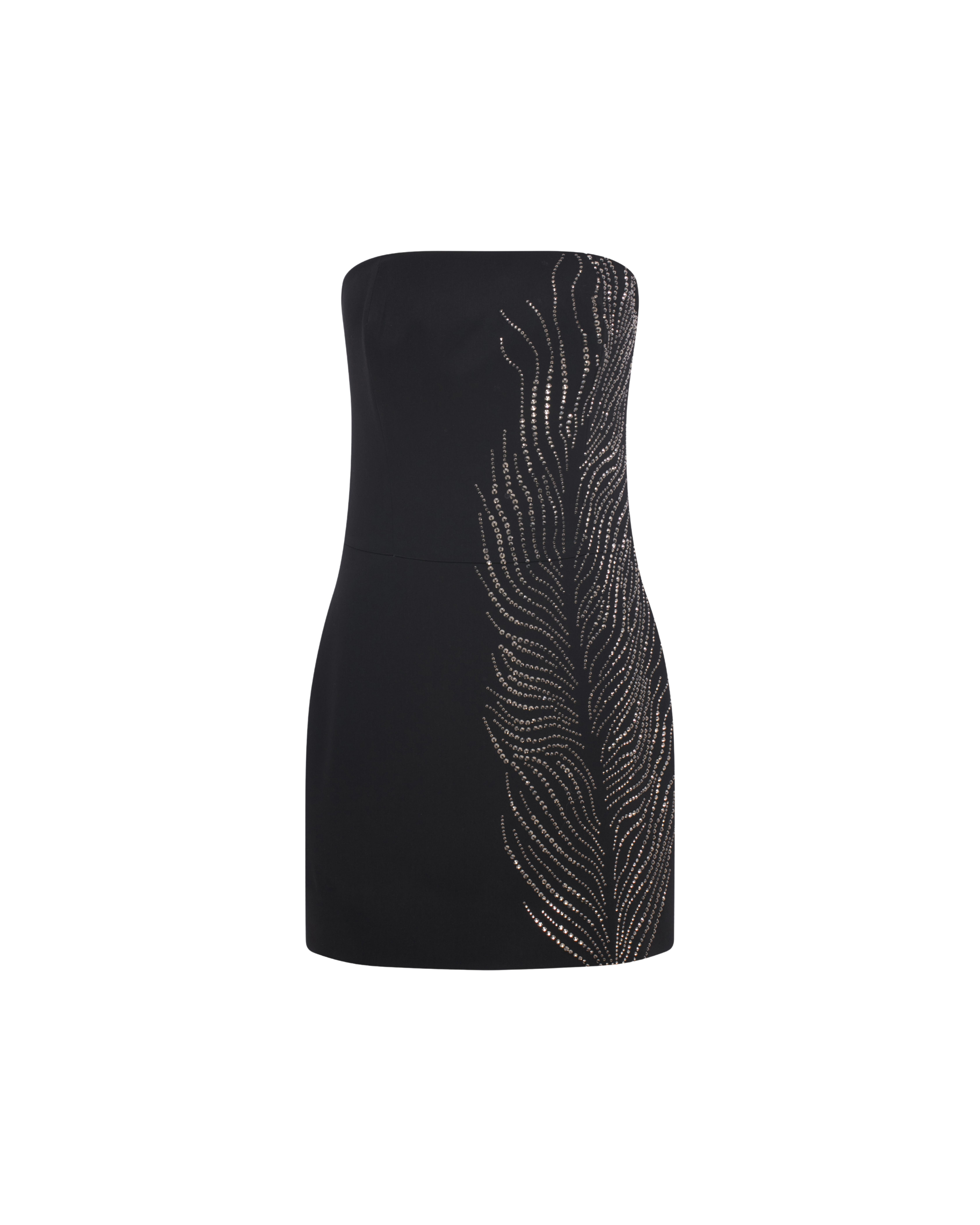 Exuding sleek evening drama with a modern, magnetic edge, this strapless black mini features a sculpted silhouette and shimmering feather-like embellishment.