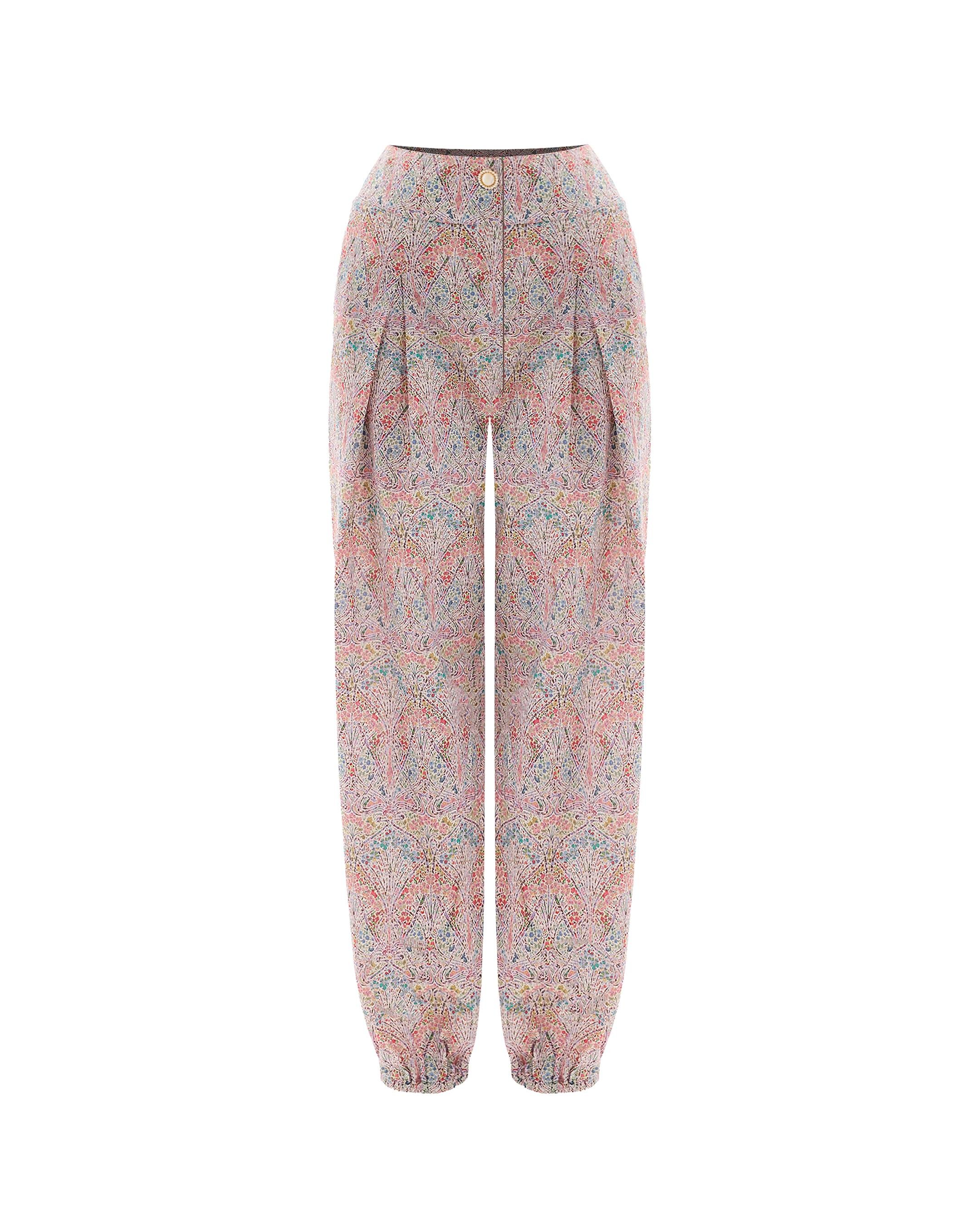 These softly pleated pants taper into gathered cuffs, draping with a fluid ease that carries both romance and refinement.