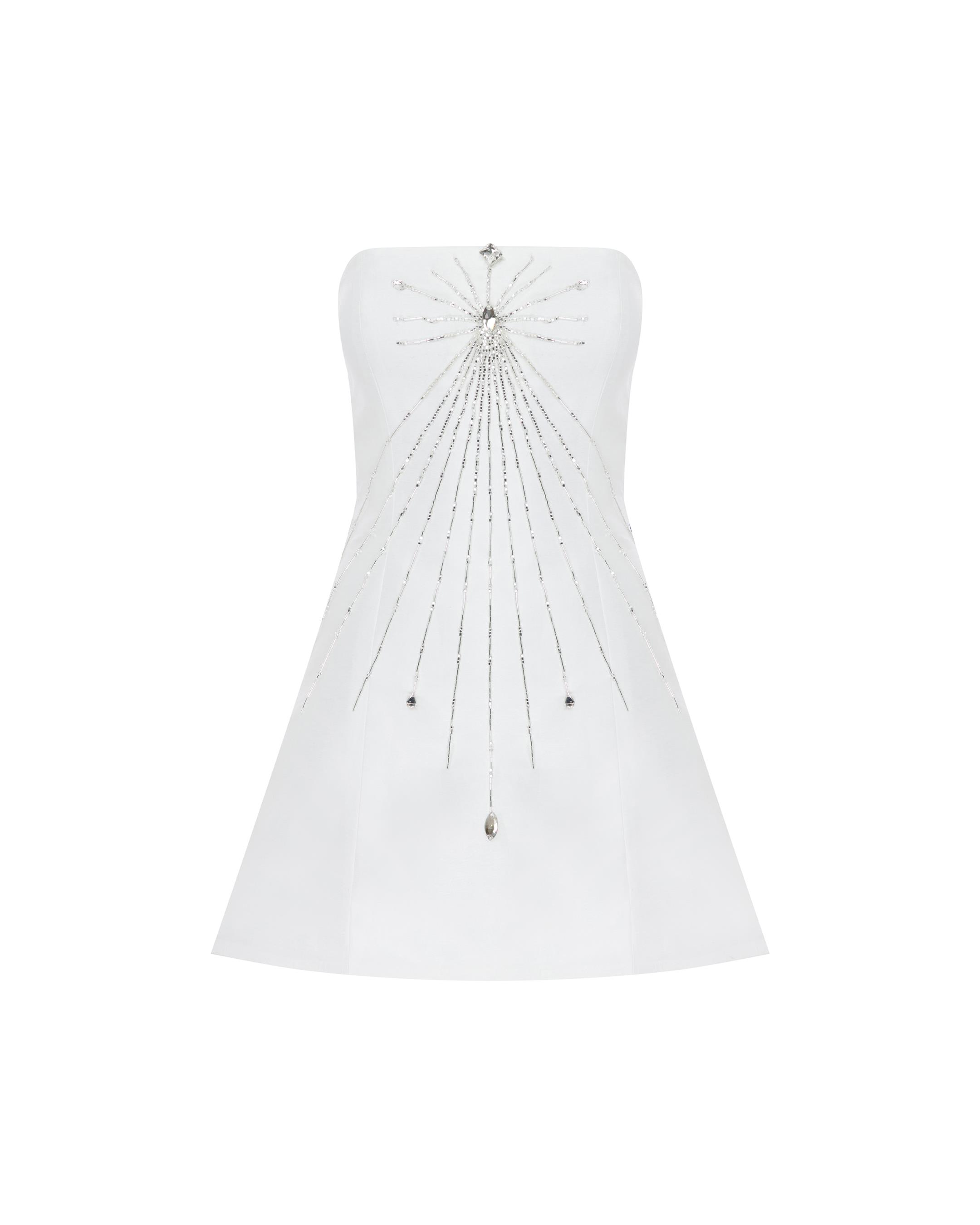 This strapless Lara dress dazzles with a starburst of crystal embellishments across a sculpted silhouette, striking the perfect balance between modern minimalism and high-octane glamour.