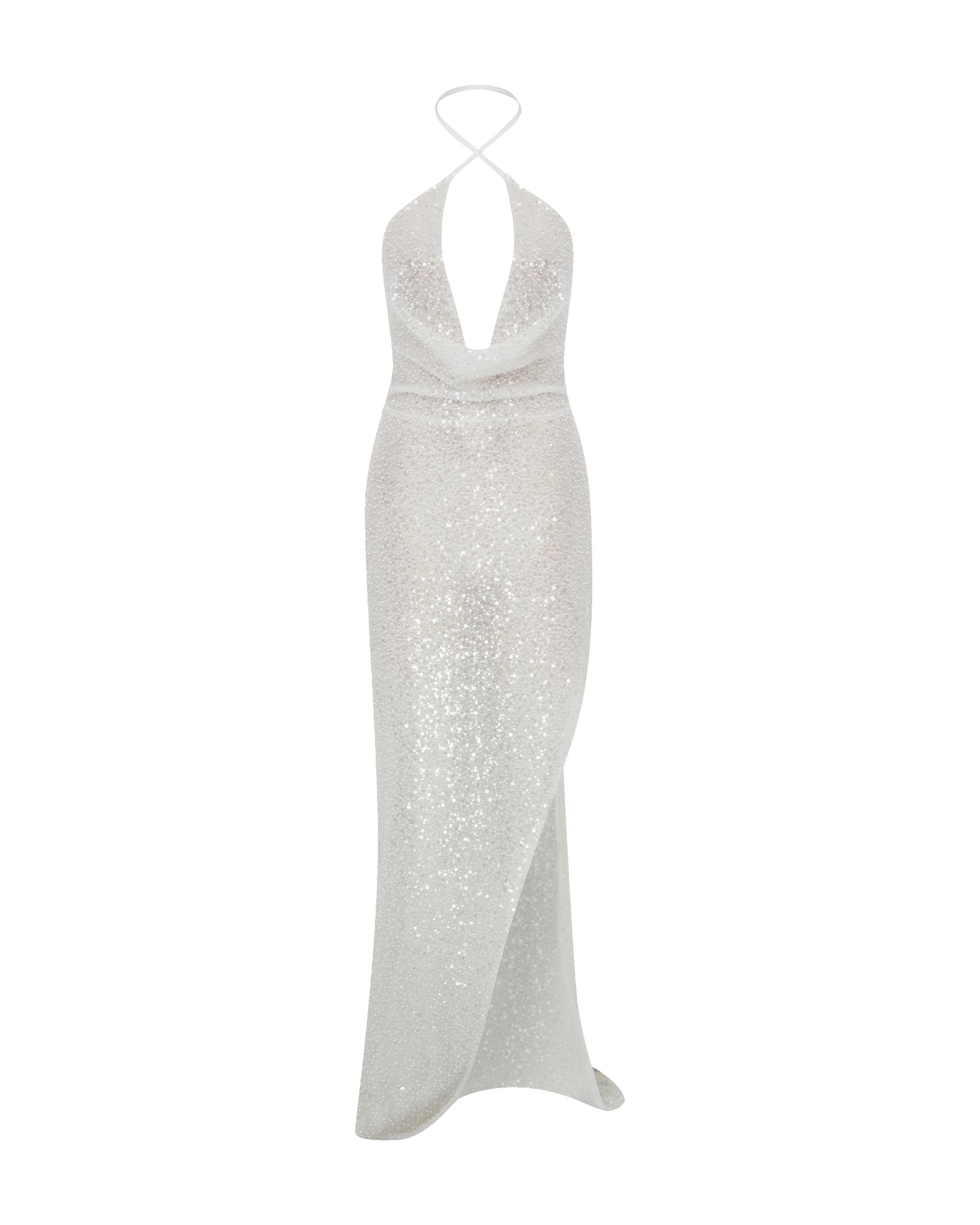 Designed for intricate events, the Marie sheer embellished gown captivates with its plunging draped neckline, thigh-high slit, and daring open back, embodying sensuality with a touch of celestial sparkle.