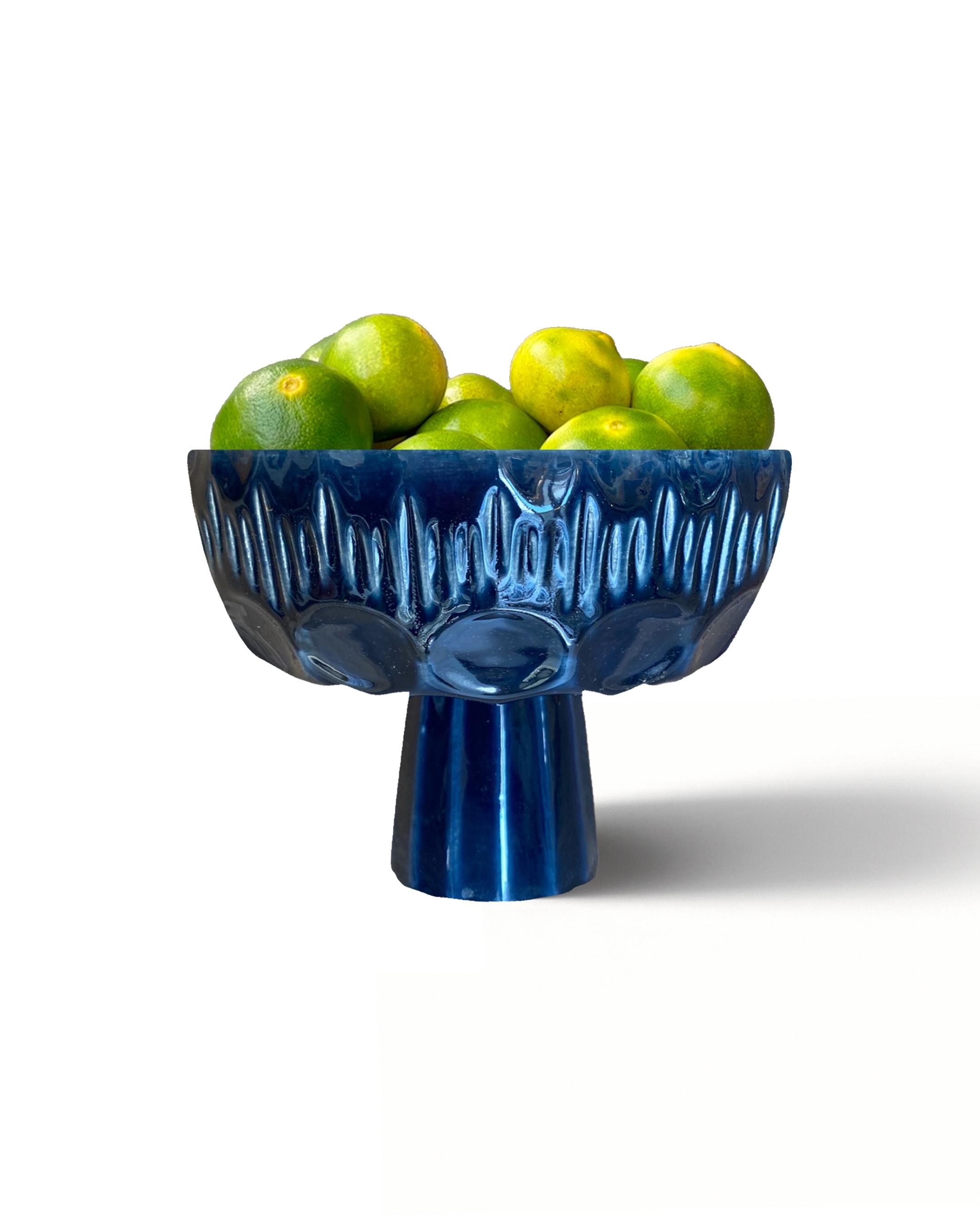 Miela stands on a tall, tapered base, its bowl wrapped in soft ridges that catch the light. The textured surface gives it a sculptural feel, making it as beautiful empty as it is when filled.