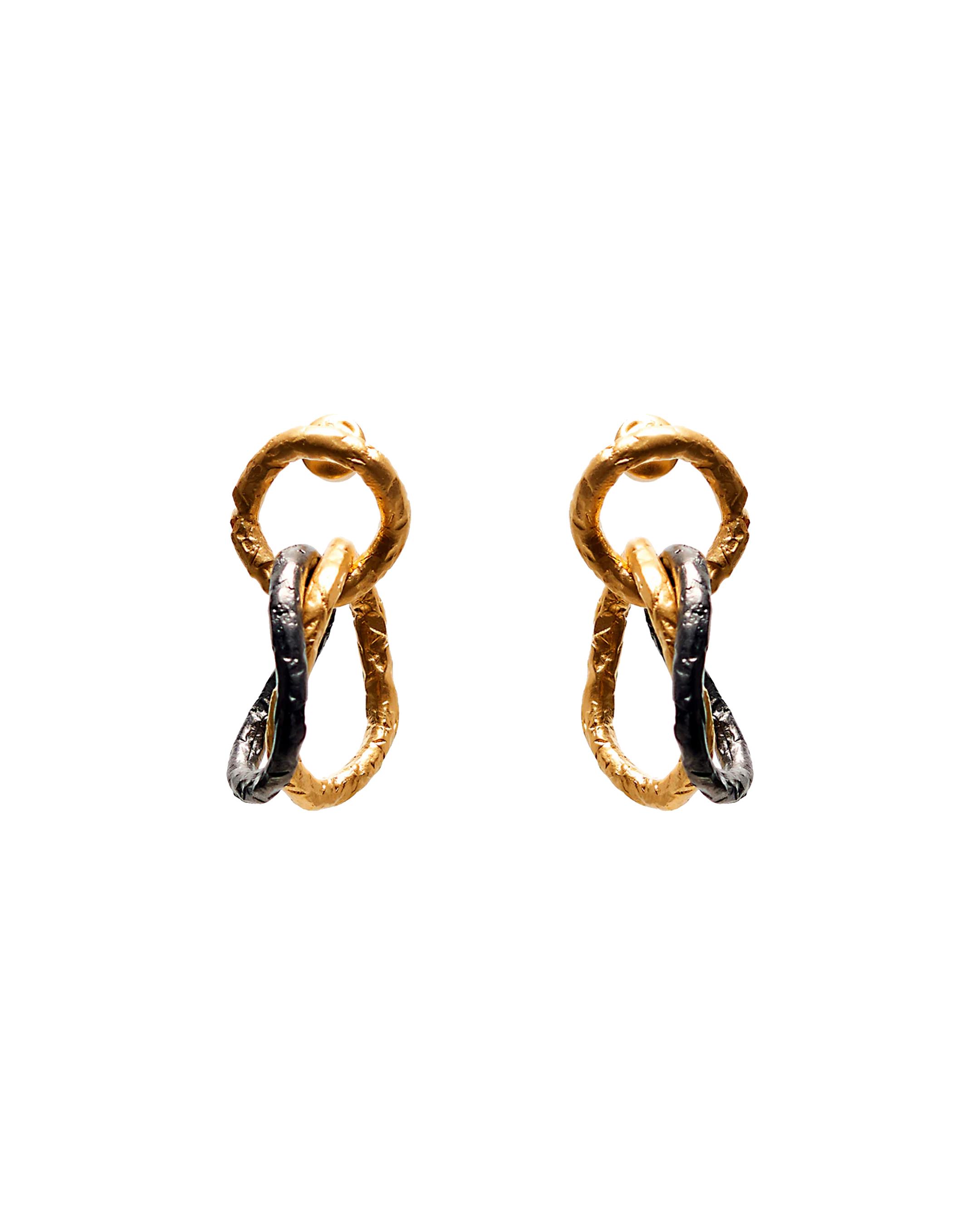 Sculptural in form and raw in texture, these earrings play with contrast; gold and darkened metal loops intertwined for a look that feels both artful and bold.
