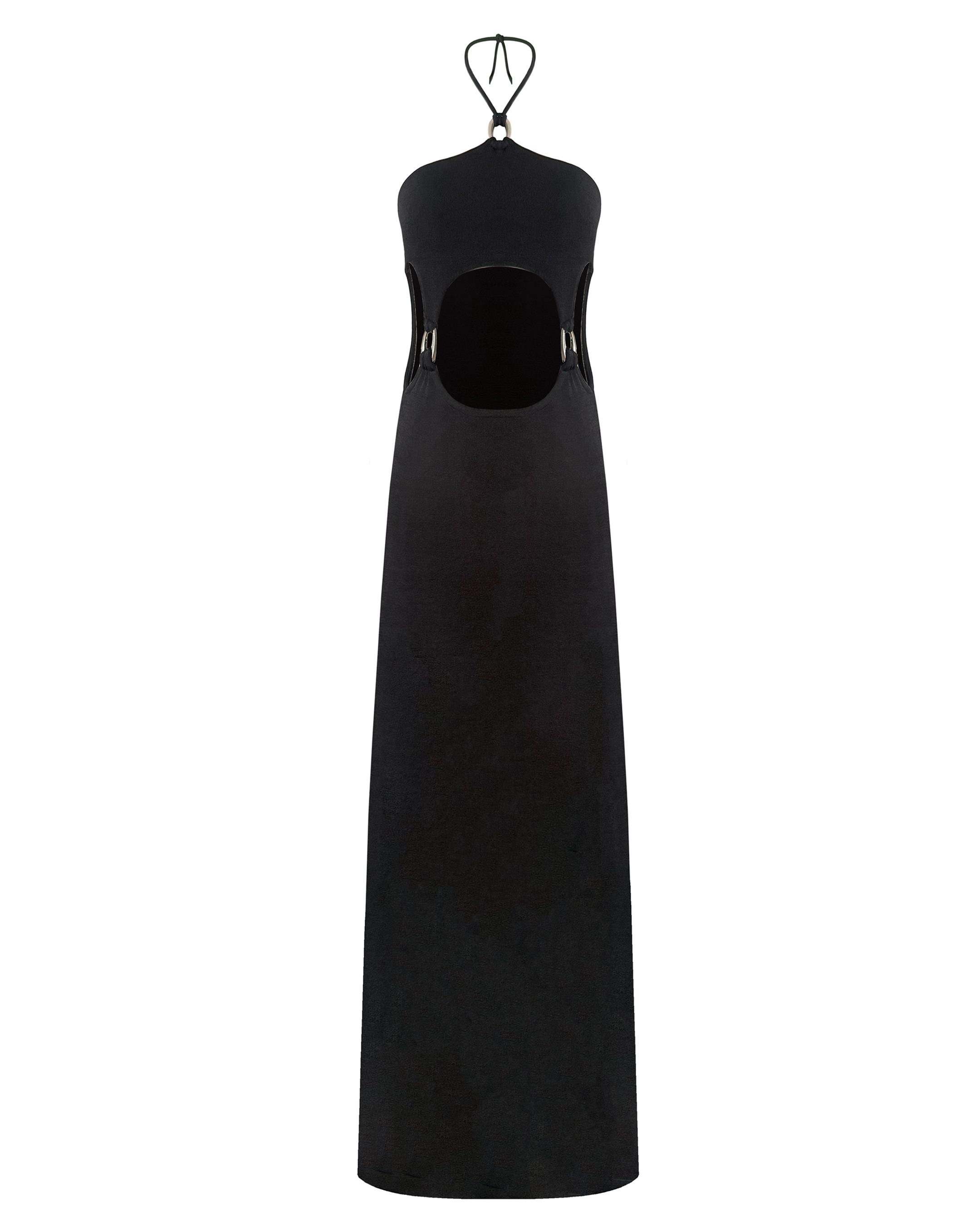 • Maxi length dress • Halterneck tie fastening with metallic ring detail • Circular cut-out at the front • Side cut-outs with additional ring details • Straight skirt with floor-sweeping hemline • Invisible zipper on center back for closure • Fabric: Knit • Handwash or dry cleaning is recommended