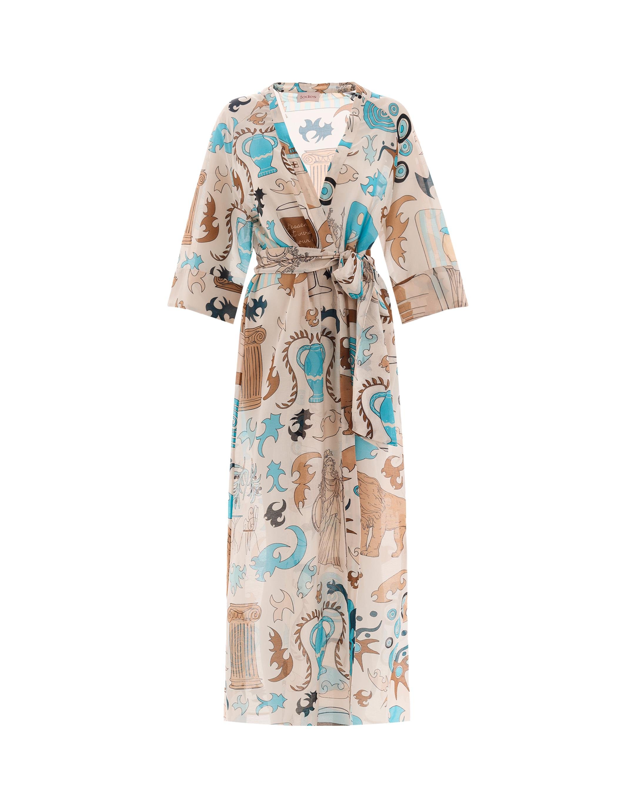 This silk Patmos model ripples with storybook patterns in sea and earth tones, transforming a simple cover-up into a statement of wanderlust and artistry.