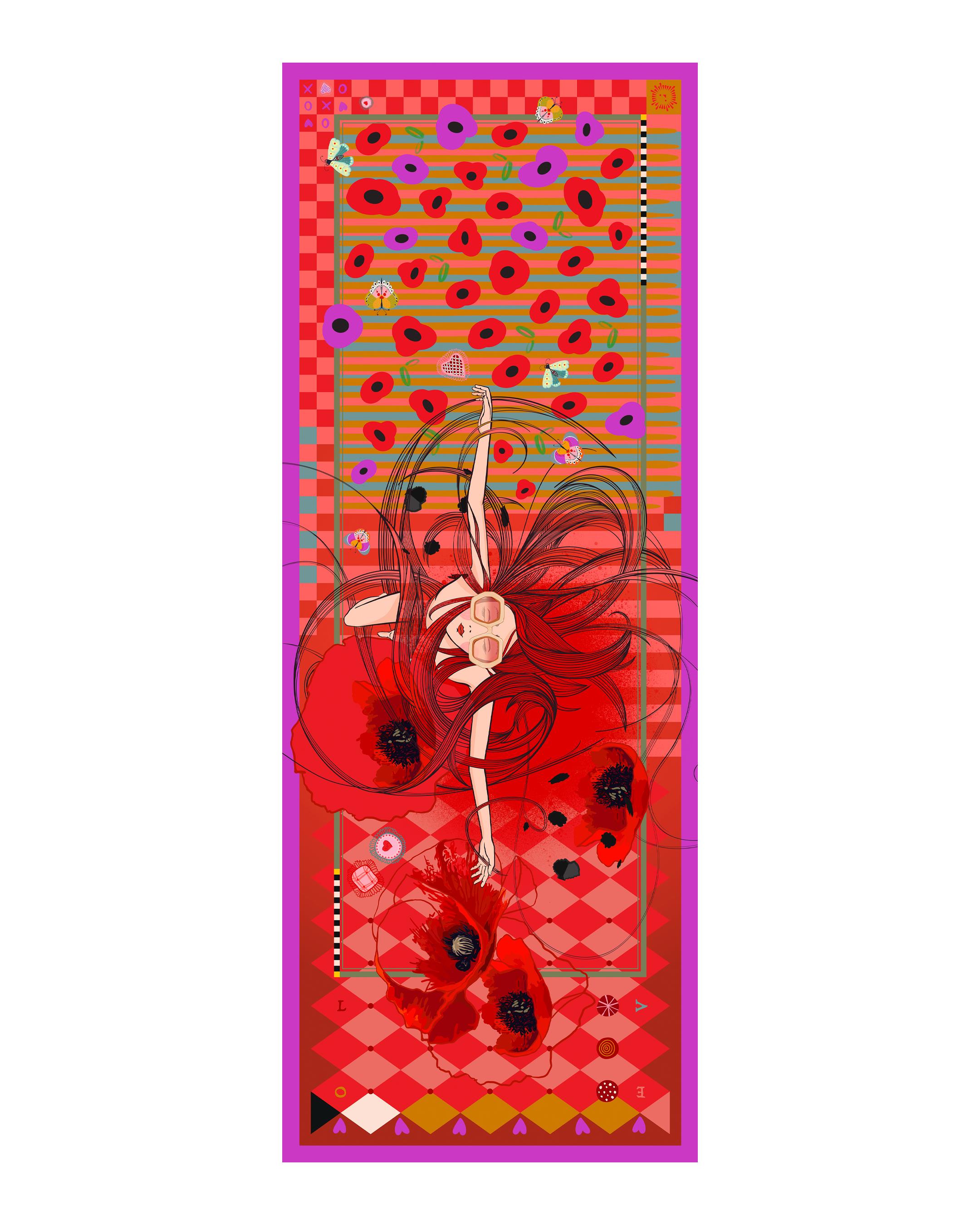 Glowing in fiery red with painterly motifs, the generous size of this scarf showcases intricate detailing, turning it into a wearable piece of art.