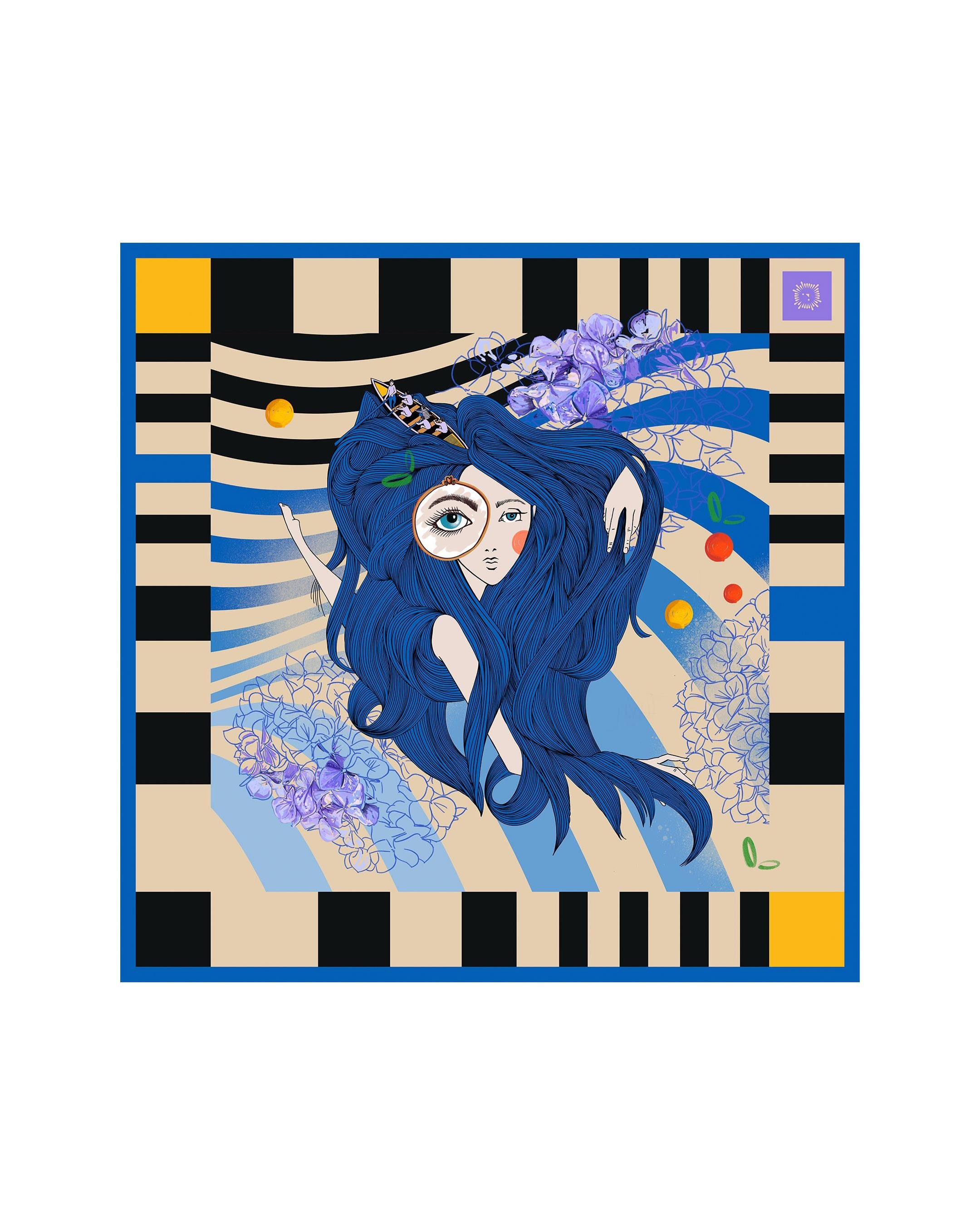 Graphic in cobalt, ivory, and golden yellow, this scarf brings a chic, modern edge. Perfect knotted at the neck with pearls for a polished yet playful finish.