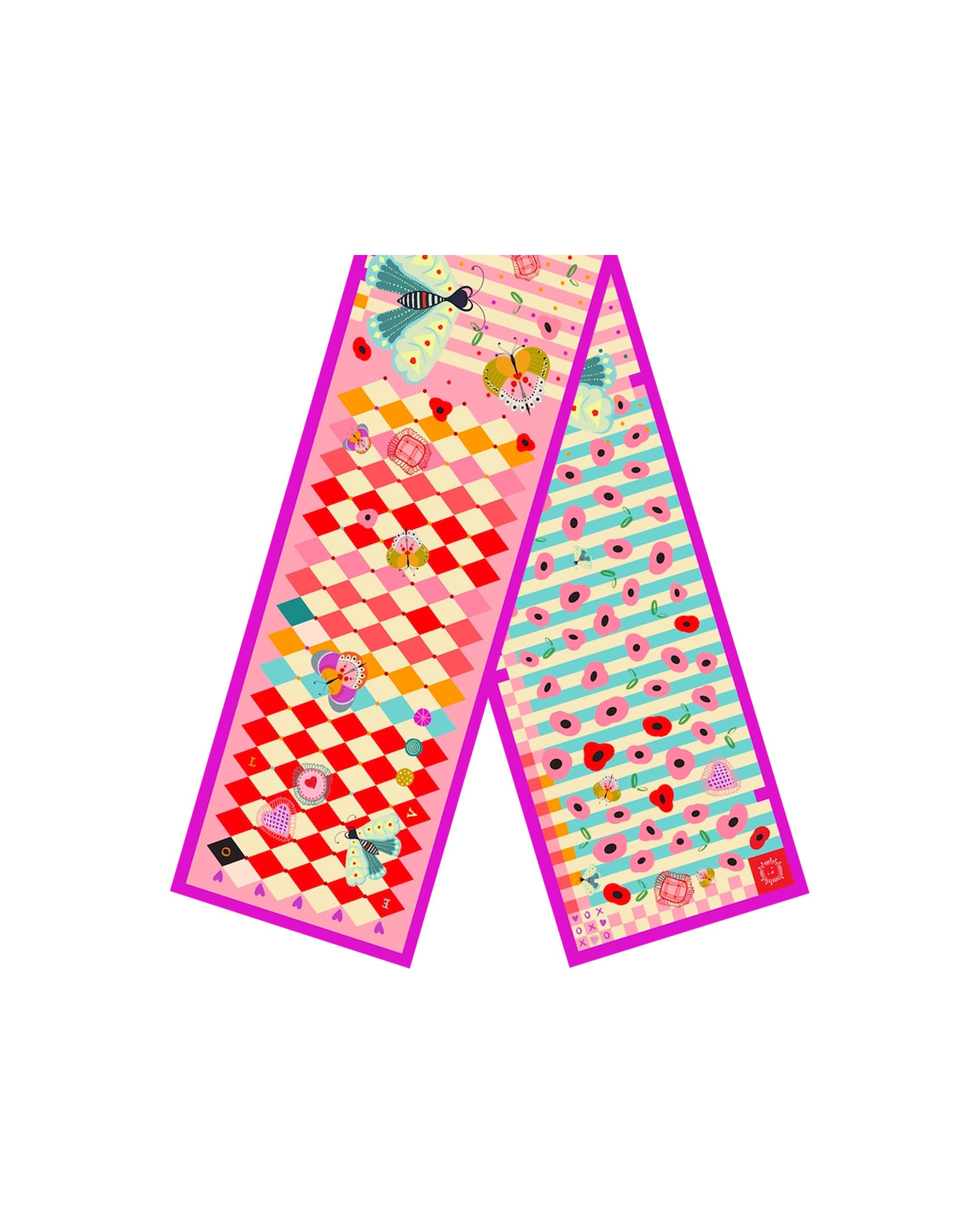 Vibrant and whimsical, this scarf mixes harlequin checks and candy-bright motifs — perfect for adding a joyful splash of color to any look.