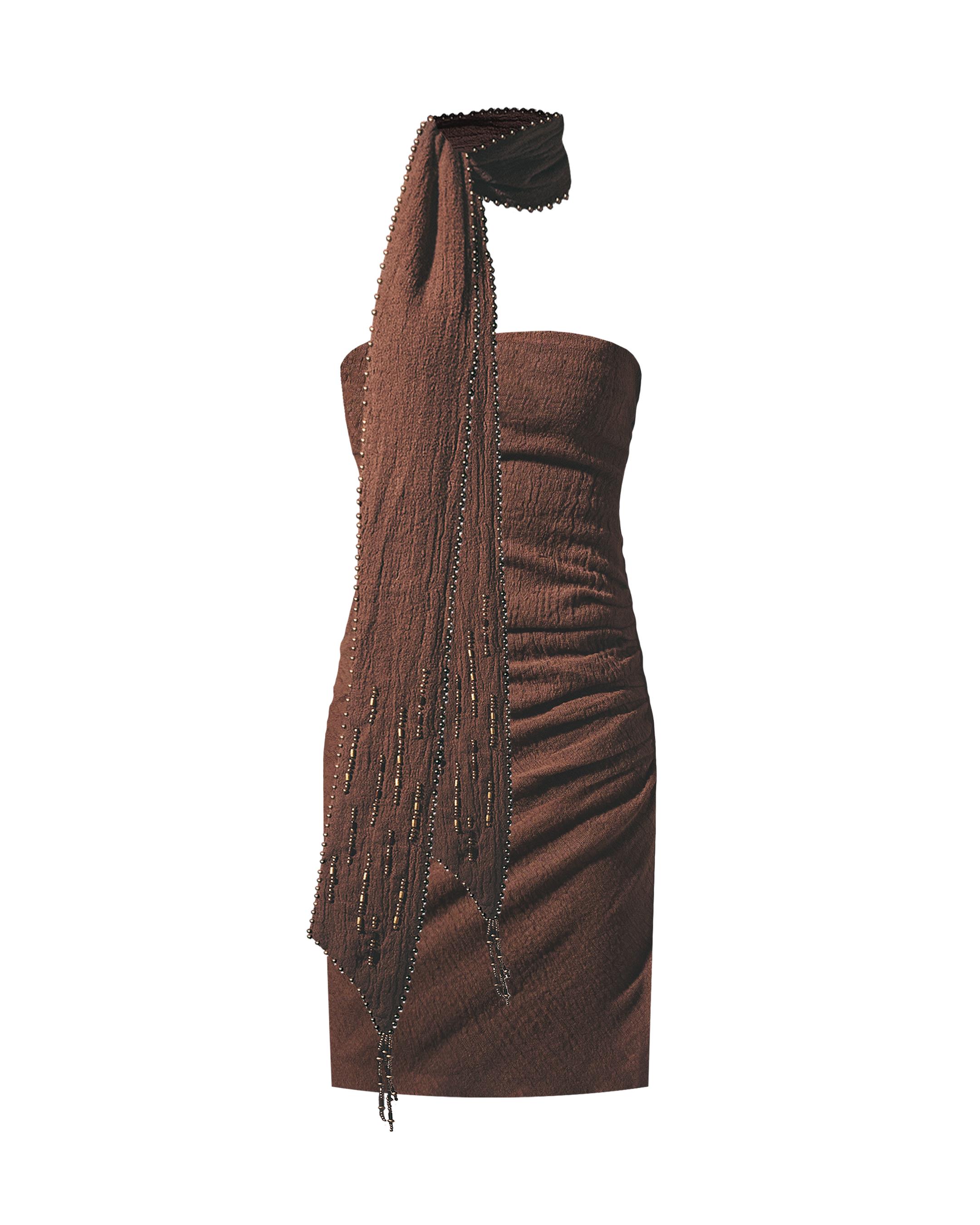 This warm, earthy brown off-shoulder mini makes your summer tan stand out even more.
