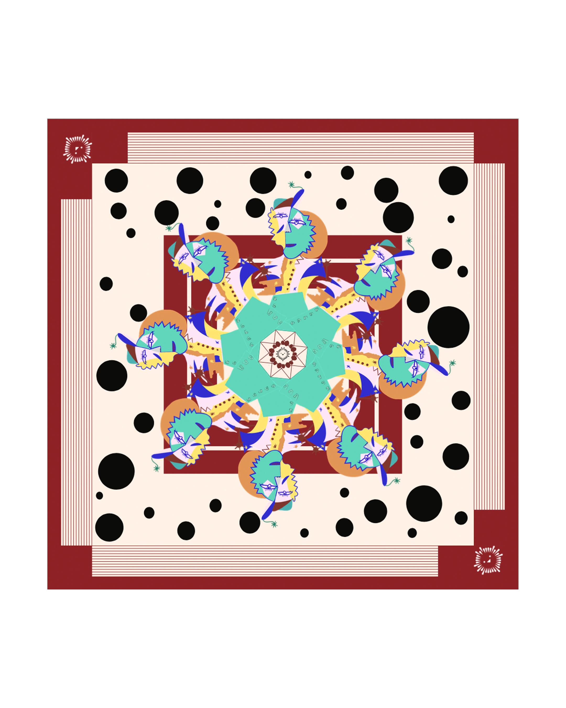 A playful collision of bold geometrics and whimsical motifs, this scarf radiates artistic energy with a modern edge — wear it draped over sun-soaked shoulders, knotted at the neck, or turned over your bag handles for an effortless pop of color.