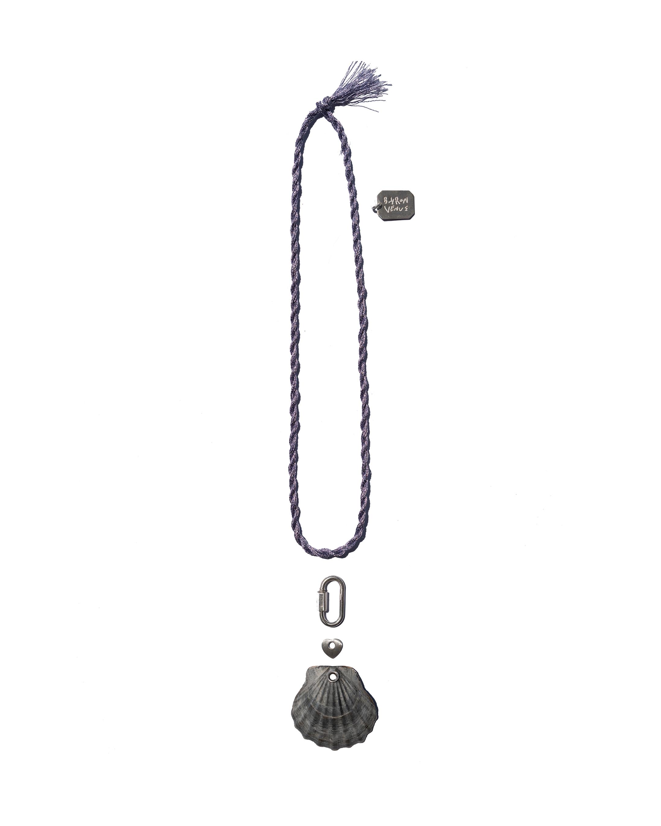 The SHELL NECKLACE strings one-of-a-kind seaside shells on a deep purple thread with silver details and interchangeable cords, capturing the sea’s poetry in a piece of personal expression.